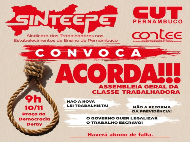 No dia 10 de novembro, sexta-feira,, de norte a sul do país, a CUT em conjunto com as demais centrais sindicais e as Frentes Brasil Popular e Povo Sem Medo, ocupará as ruas para defender os direitos da classe trabalhadora, combater as reformas trabalhista e previdenciária, por meio de paralisações nos locais de trabalho e atos públicos em praças e avenidas. No Recife, será realizada uma Assembleia Geral da Classe Trabalhadora, na Praça da Democracia do Derby, com concentração a partir das 09h.